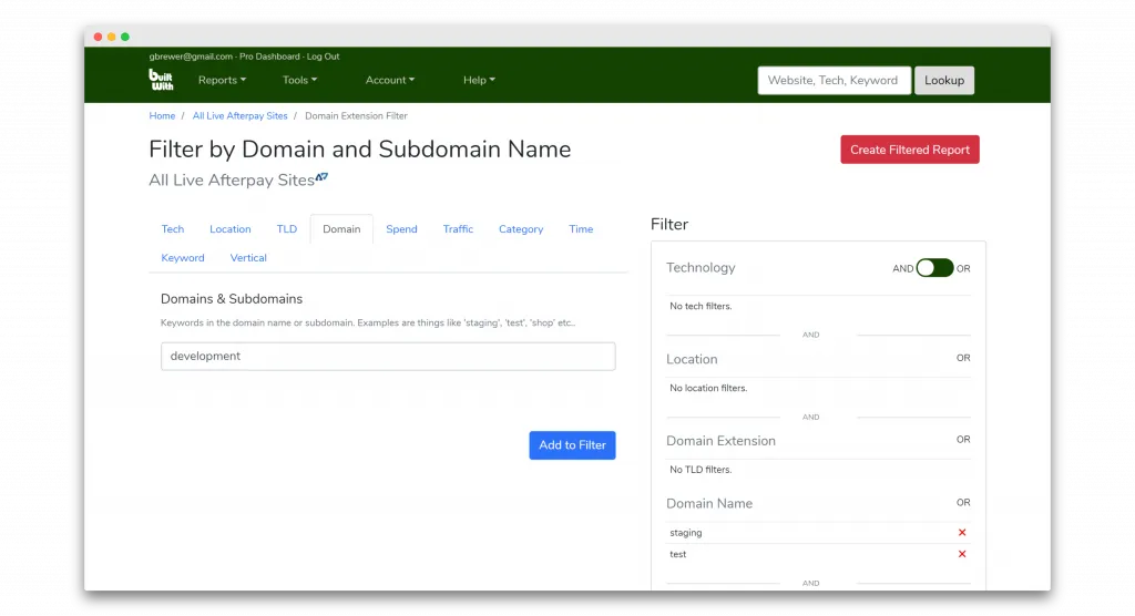 We've added the ability to filter reports by websites that have particular keywords in their domain name or subdomain to aid this.