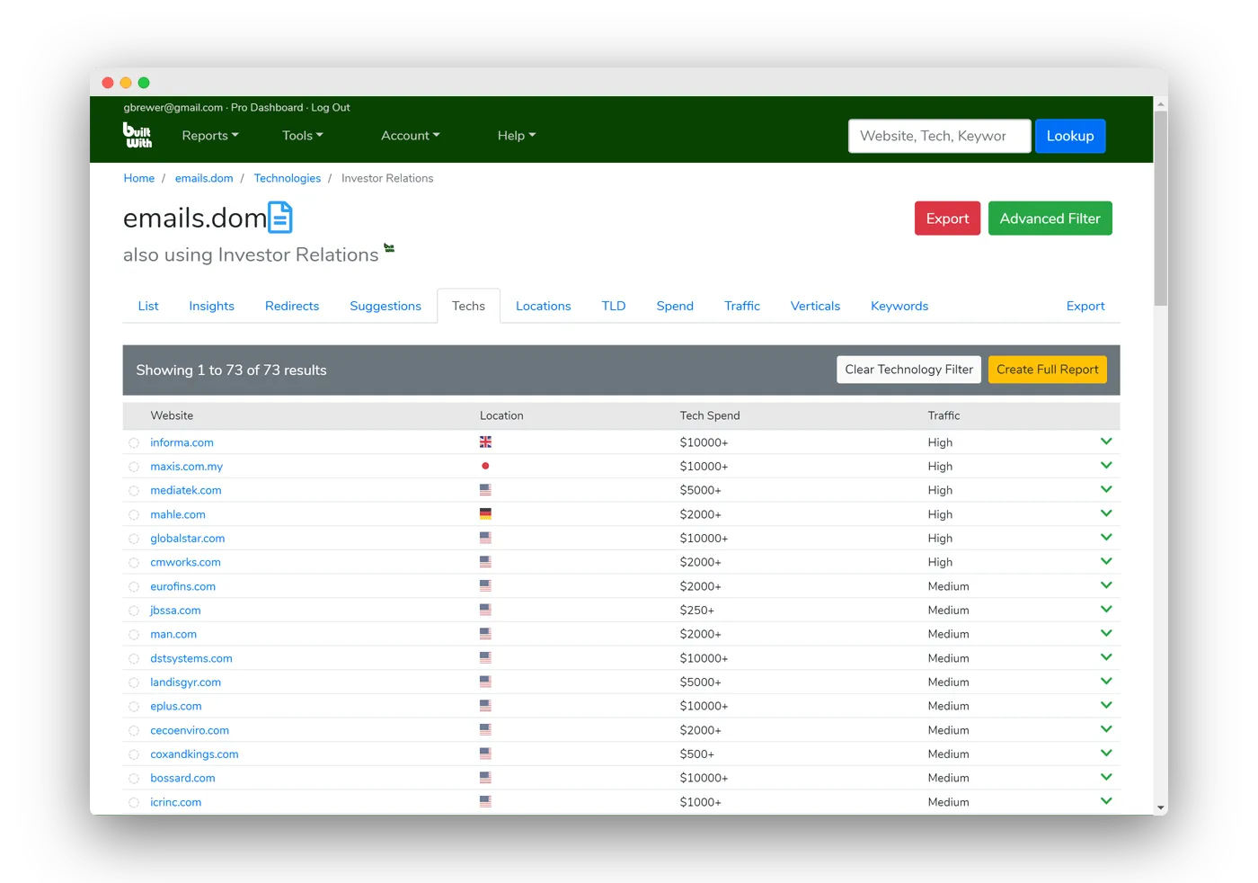 Step 3: Filter the list down by relevant technologies - to find financial and large companies we tried the 'Investor Relations' technology as a filter as this is sites that are most likely listed on a stock exchange (See KB Article).