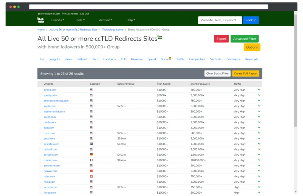 You can see a demo of how to do this here - https://kb.builtwith.com/creating-reports/examples/filtering-a-report-by-brand-followers/