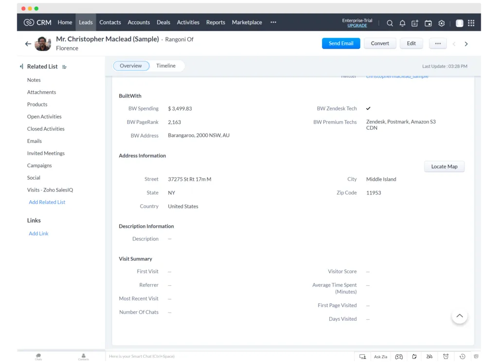 You can now sync up to 300,000 Leads, Contacts and Accounts with ZohoCRM from BuiltWith everyday. You can add thousands of properties that we provide and get this information embedded directly into your CRM.