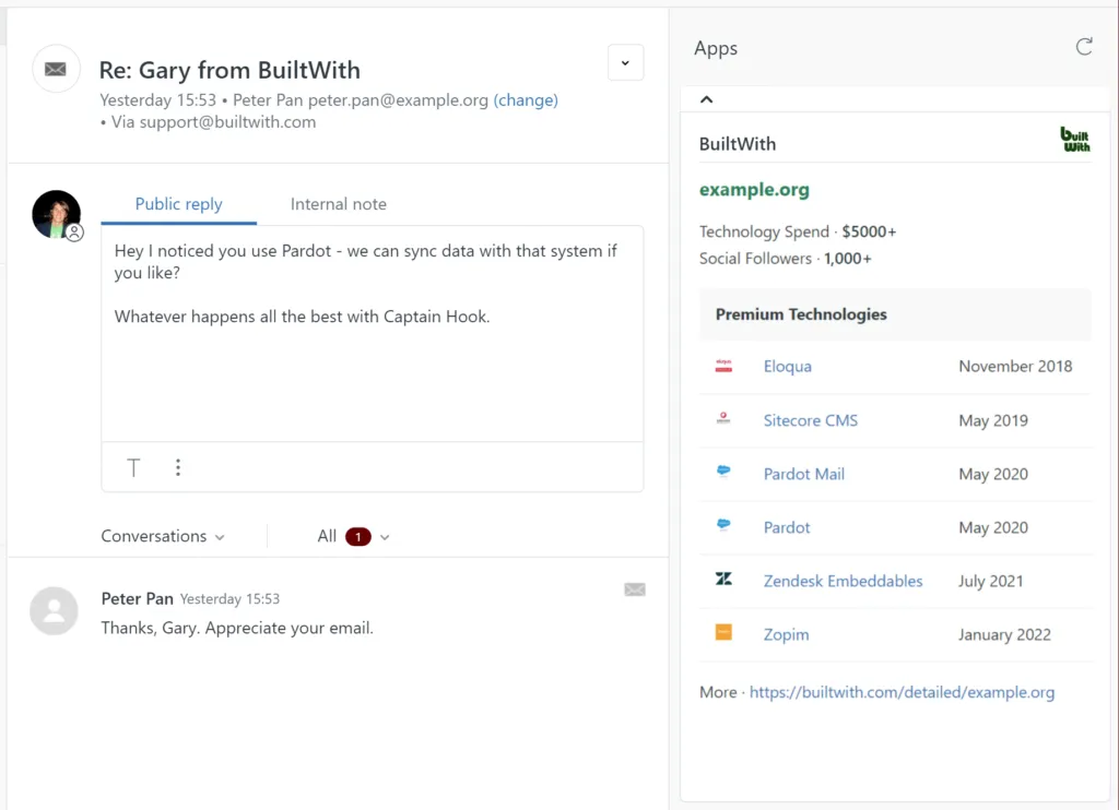 If you use Zendesk for your support and sales tickets then the BuiltWith Zendesk App is a must have. It basically highlights the technology spend and premium technologies that the customer of the ticket you are looking at has.